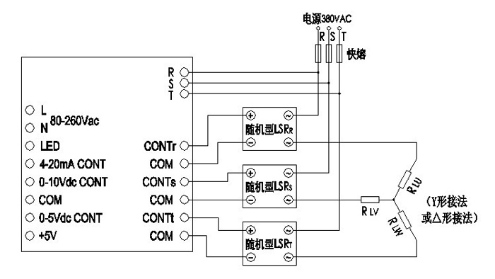 本系統(tǒng)主要應(yīng)用于大功率電加熱控制、變壓器原邊調(diào)壓等場(chǎng)合,由一個(gè)三相移相觸發(fā)器LSJK-TSR型或LSJK-TSRG型、三個(gè)200A(或300A、400A)的隨機(jī)型固態(tài)繼電器SSR、一個(gè)A型散熱器、一個(gè)交流風(fēng)扇12038組合而成,適合各類機(jī)械、礦山、化工、紡織、及其他機(jī)電一體化等領(lǐng)域。